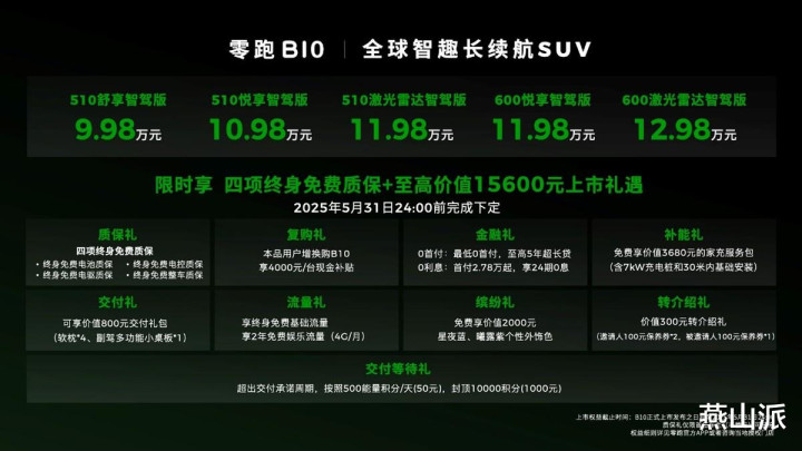 零跑B10交付节奏方面:510悦享智驾版上市即启动交付,510激光雷达智驾版及舒享智驾版4月中下旬开启交付,600km续航版本将在6月初开启交付。